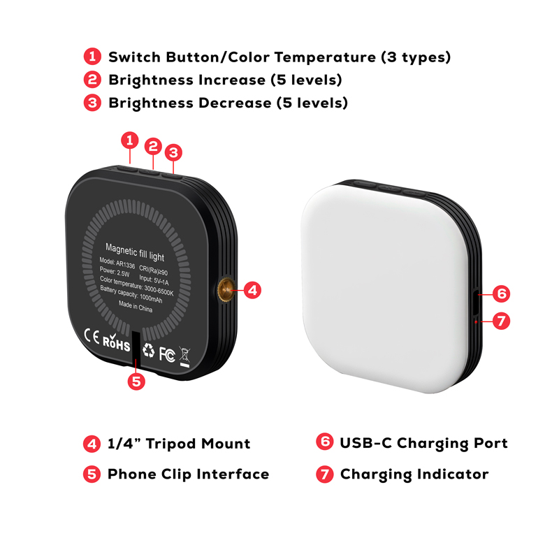 Features: The Essex LED Selfie Light is a cutting-edge device. This ultra-compact phone selfie light features 45 premium LEDs and uses Magsafe technology to securely attach to magnetic phones. Non-magnetic devices can also use the included magnetic ring for easy setup on Android phones and laptops. Its 1000 mAh rechargeable battery allows the LED to operate for 2.2 hours at full brightness. Additionally, the Essex offers 3 LED colour options, along with five colour temperature levels, five brightness settings, and supports 360 horizontal rotation and 270 vertical tilt for optimal lighting angles. This portable LED light perfectly enhances picture quality for selfies, soft lighting for recording podcasts, makeup artists, TikTok live streams, laptop video calls, and webcam lighting for desktop monitors. The Essex is compatible with iPhone 16 Pro Max, Plus 15/14/13/12, Mini, iPad Pro, Samsung Galaxy S24/S23/S22, tripods, and camera flash mounts. This selfie light includes a 360 multifunctional phone clip, cold shoe base, magnetic ring, Type-C charging cable, and user manual. Material: ABS. Certification: CE, FCC, RoHS. Colours: Black. Product Size: 72 x 72 x 15 mm. Branding Area: 50 x 50 mm (light-up panel), 20 x 11 mm (mounting clip). Standard Packaging: Coloured Box (80 x 80 x 60 mm). Price includes: 1 Col Pad. Setup is included.