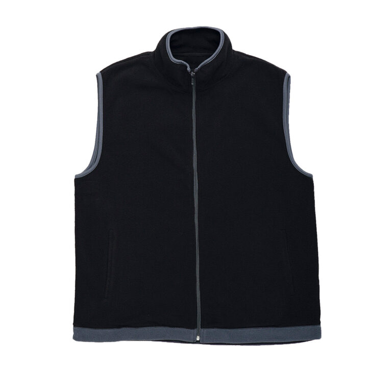 280gsm anti-pill polar fleece, Classic fit, Binding on collar and armhole, Two side pockets. Colours: black/charcoal. Sizes: S-3XL
