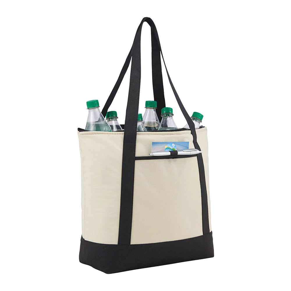 Insulated with heat-sealed water-resistant lining. Zippered main compartment with double 24 inch handles. Open front pocket with pen loop. Capacity of approximately 24L. Colours: Black,Royal Blue. Sizes: 445mm(w) x 343mm(h) x 152mm(d). Packaging: Bulk Packed. Materials: 80g Non-Woven Polypropylene. Price includes: NI Printshop - Transfer Full Colour Per Position. NI Printshop - Transfer Full Colour Per Position. Setup is included.