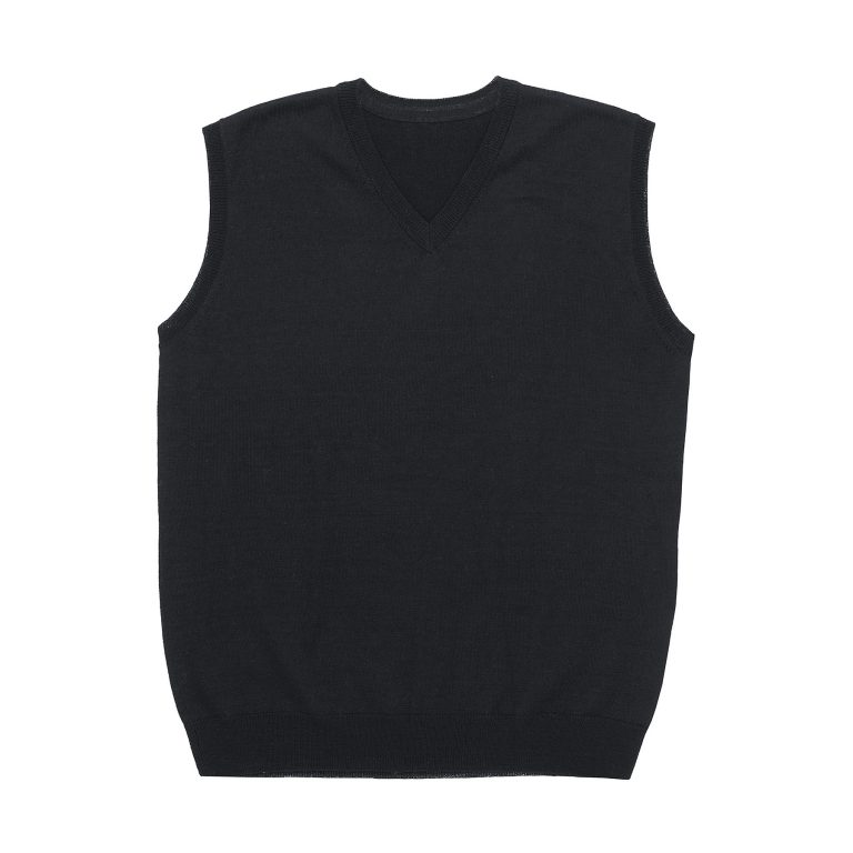 100% merino wool single jersey, Fully fashioned, 12 gauge, Single jersey vee neck binding, 1x1 rib armhole band and hem. Colours: black. Sizes: S-5XL