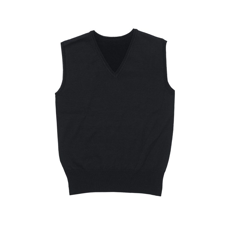 100% merino wool single jersey, Fully fashioned, 12 gauge, 1x1 rib vee neck band, 1x1 rib armhole band and hem. Colours: black. Sizes: 8-22