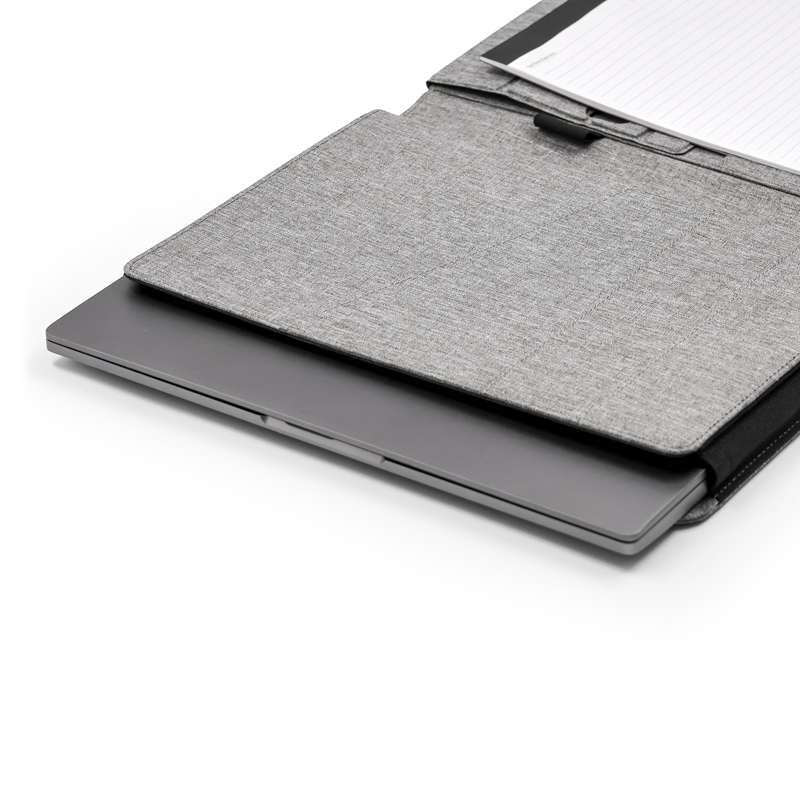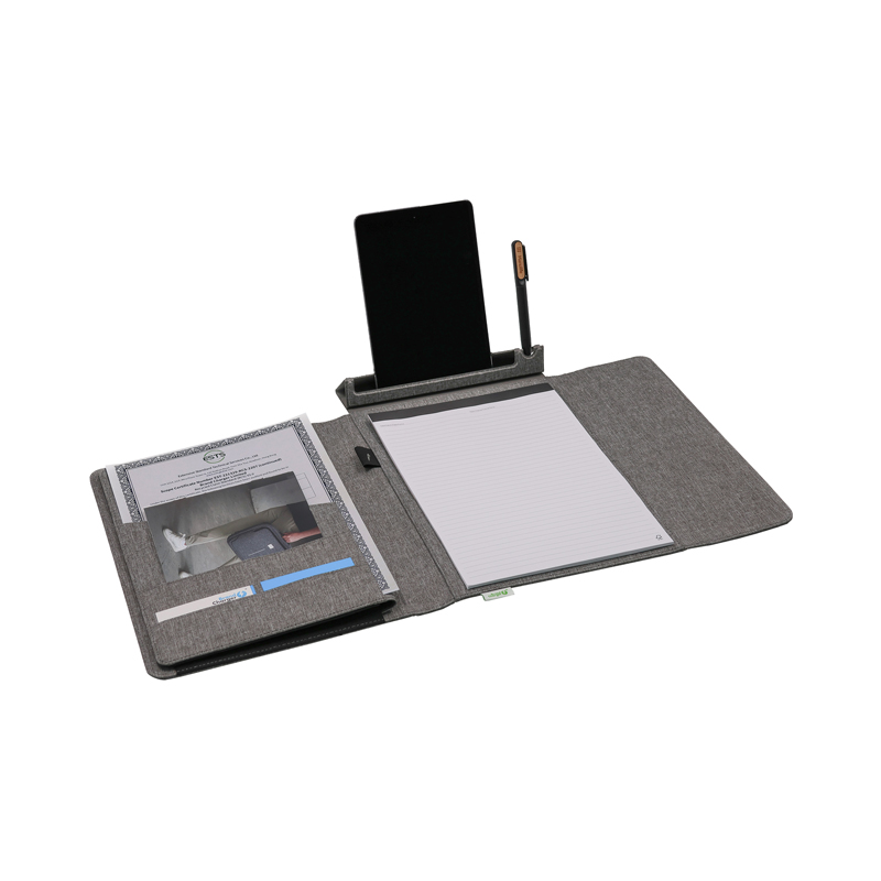 Features: The Noty Folio Eco is where style meets sustainability. Crafted from recycled PET bottles and paired with an FSC-certified paper notepad, it s a premium business essential designed for professionals on the move. Inside, you ll find space for an A4 notepad, an expandable pocket that fits tablets or laptops up to 13 , a fold-out phone or tablet stand, a pen holder, and multiple compartments for business cards and travel essentials. Every detail is built for convenience, helping you stay organised in the busiest of lifestyles. Versatile, practical, and eco-conscious, the Noty Folio Eco makes a thoughtful corporate gift with a touch of quality and responsibility. Material: Recycled PET bottles and FSC-certified paper. Certification: BSCI, RoHS, RCS - Recycled PET Bottles, FSC-Certified Paper. Colours: Grey. Product Size: 320 x 265 x 25 mm (closed). Branding Area: 80 x 50 mm (within the flap branding area). Standard Packaging: RPET PE Bag. Price includes: 4CP Digital Print. Setup is included.