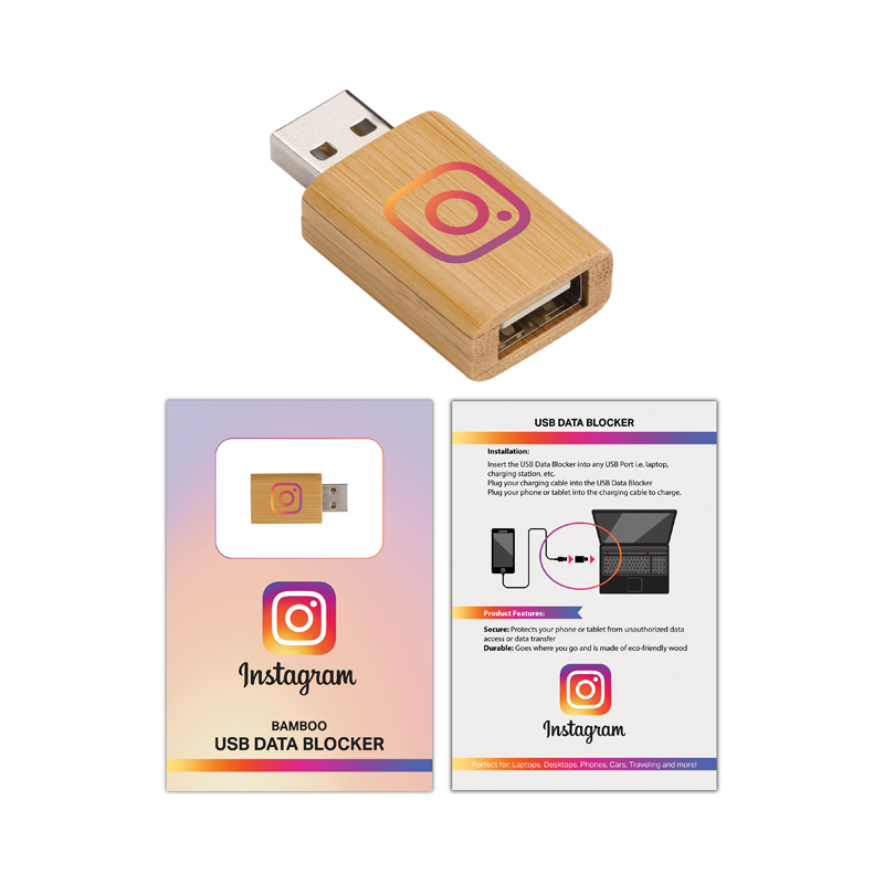 Features: Data theft is difficult to detect and can be harmful and detrimental to both you and your device user. Every device that is charged via a USB cable is vulnerable. Charging your device through a secure data blocker removes the threat of any unwanted data transfers, and without the risk of hacking or the uploading of viruses. Prior to charging your device, simply plug your charge cable into the data blocker before plugging it into the charging source. Includes standard backing card with instructions or a custom-designed backing card. Material: Wood. Certification: CE, FCC, RoHS. Colours: Bamboo, Walnut. Product Size: 43.2 x 21.01 x 10.2 mm. Branding Area: 21.5 x 12.5 mm. Standard Packaging: Standard Backing Card, Custom Backing Card. Price includes: 4CP Digital Print & Standard Backing Card. Setup is included.